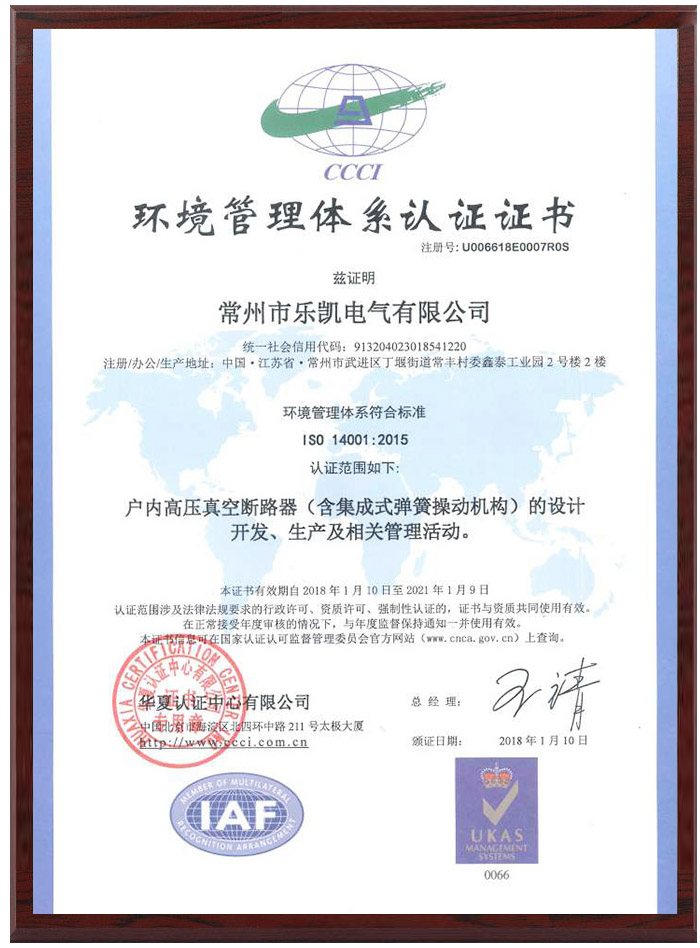 环境管理体系认证证书